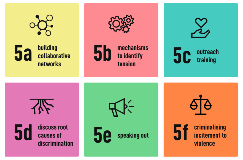 Human Rights Council Resolution 16/18 is notable for the eight action points it contains in operative paragraph 5, subparagraphs (a) to (h). The eight points commit all member States to take specific measures at the national level in policy, law and practice, to address intolerance and discrimination based on religion or belief and its root causes. The eight action points are intended as complementary measures that should be implemented holistically and comprehensively. They can be explored on this page.